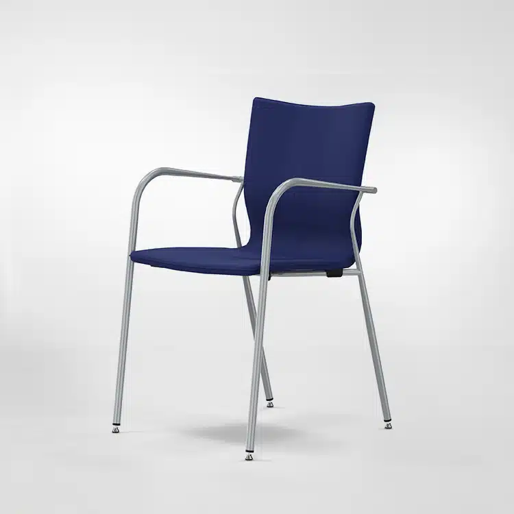Se trata de una silla confidente color azul atemporal que no atiende a modas ni tendencias, pudiéndose reinventar a sí misma con sus múltiples opciones de personalización en materiales y acabados sin perder si esencia, elegancia y calidad.