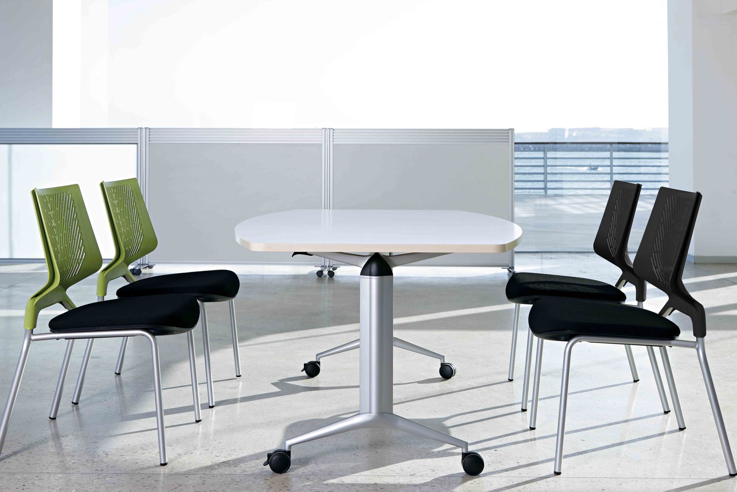 Para espacios colectivos y dinámicos, la mesa Trama de Actiu presenta una columna cilíndrica, fabricada en acero, puede encontrarse con acabados en aluminizado, blanco y cromado que garantizan la integración en cualquier entorno. Para los usos intensivos, se facilita el borde amortiguante en la superficie, perfecto para el trasiego diario y movimiento continuado de las mesas.