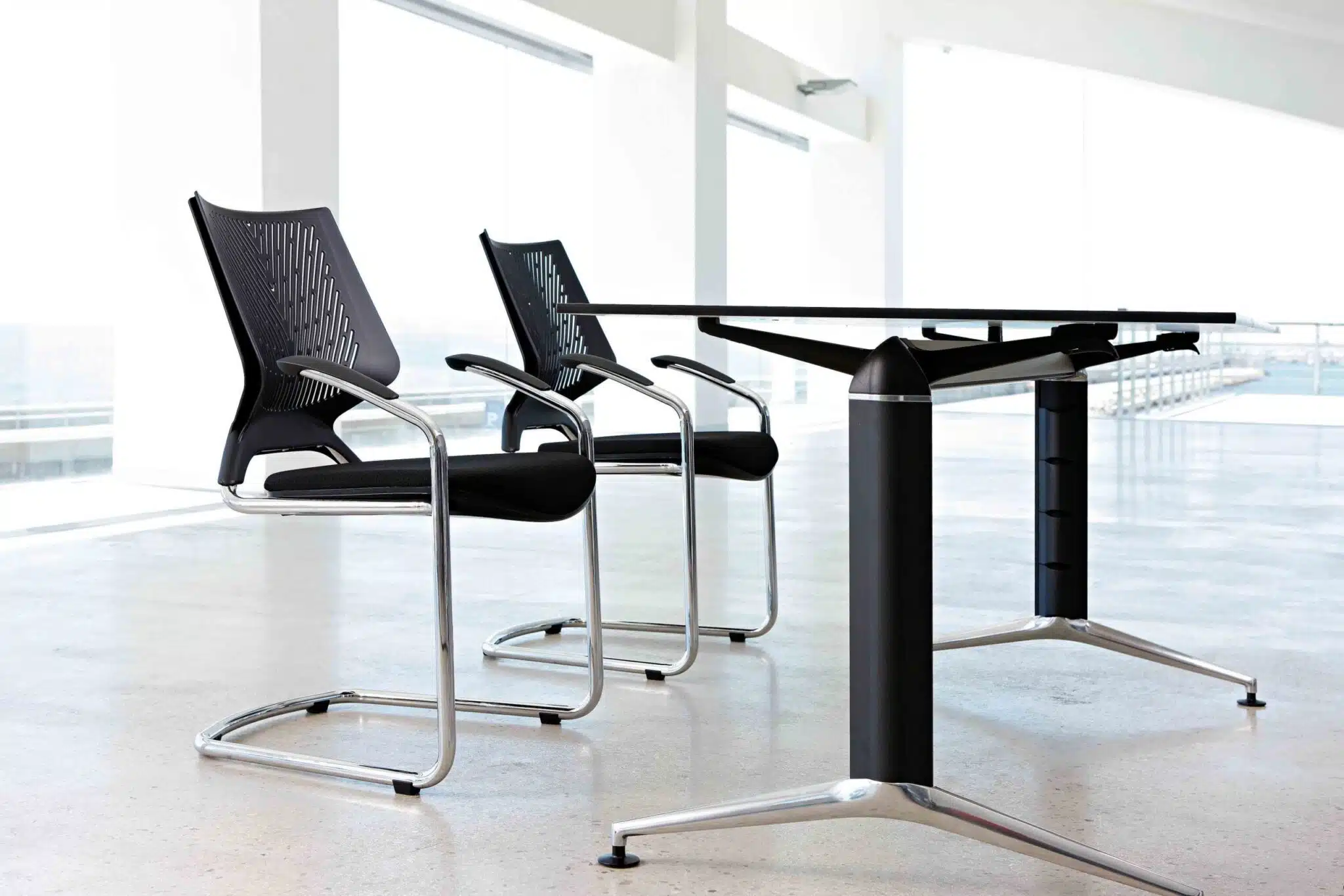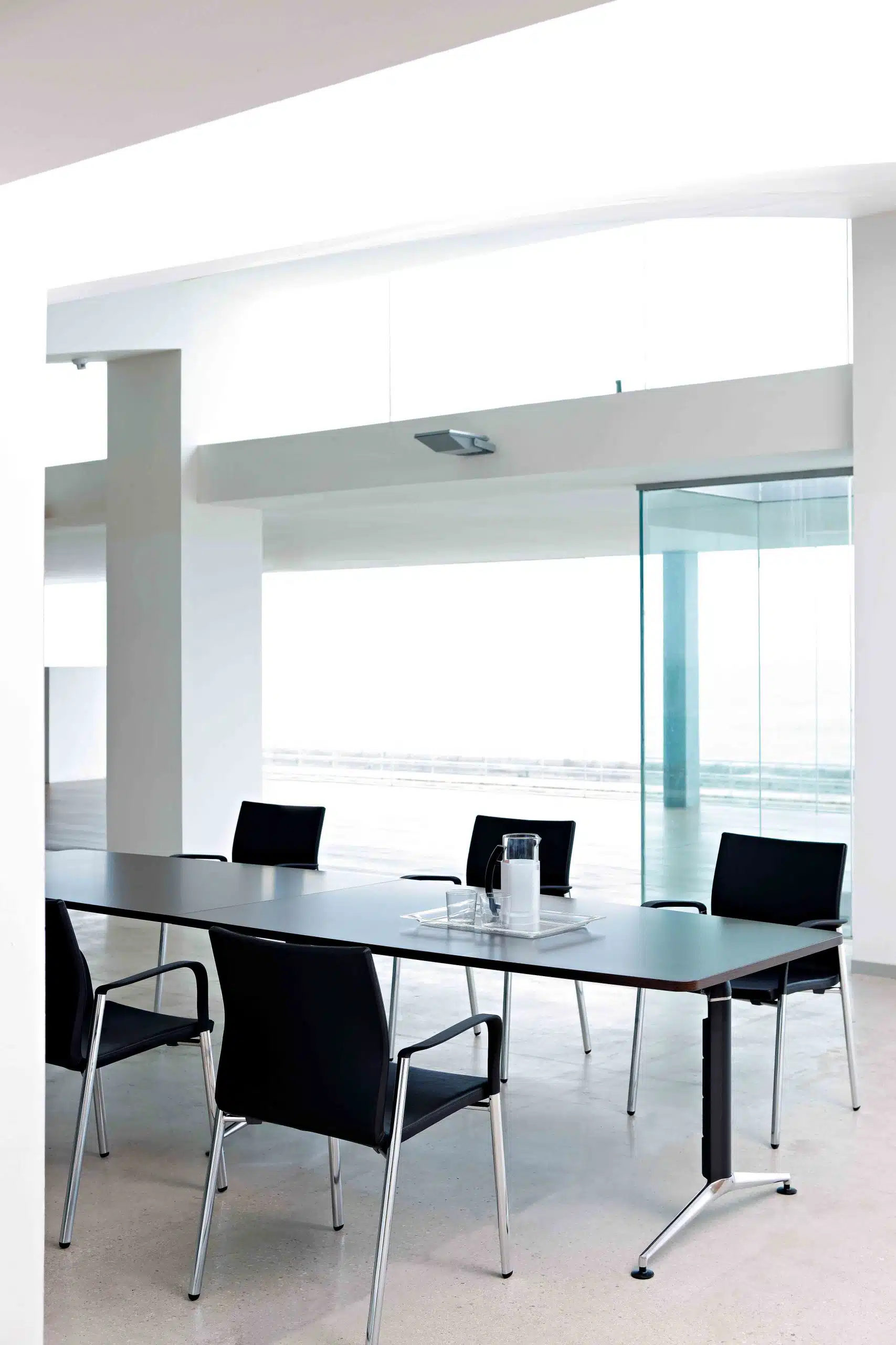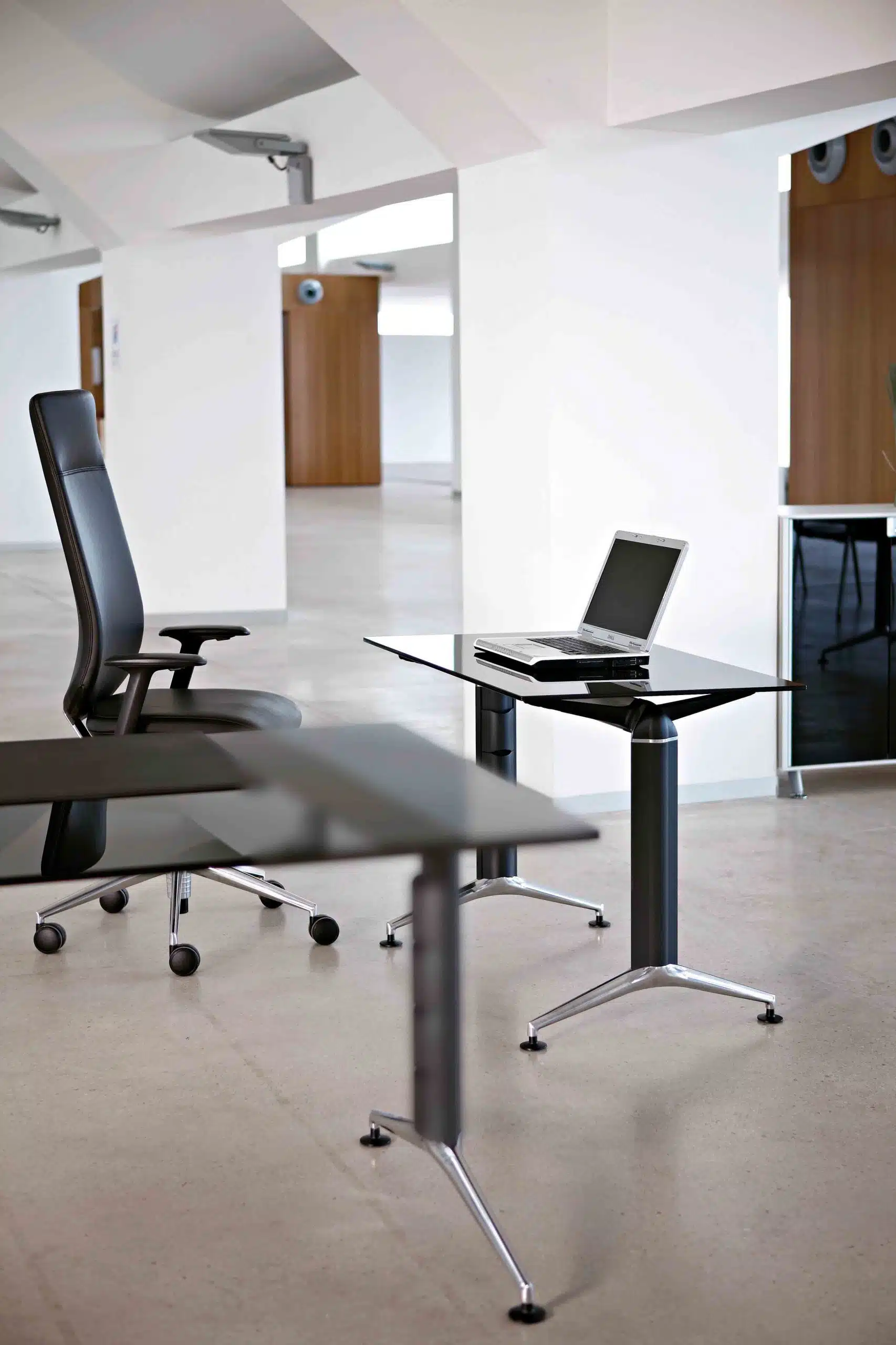 Si combinamos los pies inyectados y las columnas extrusionadas en aluminio con los acabados en vidrios o fenólicos para las superficies, nos resulta una mesa que nos enseña el lado más elegante de la mesa operativa Trama, pensado para despachos personales y de dirección.