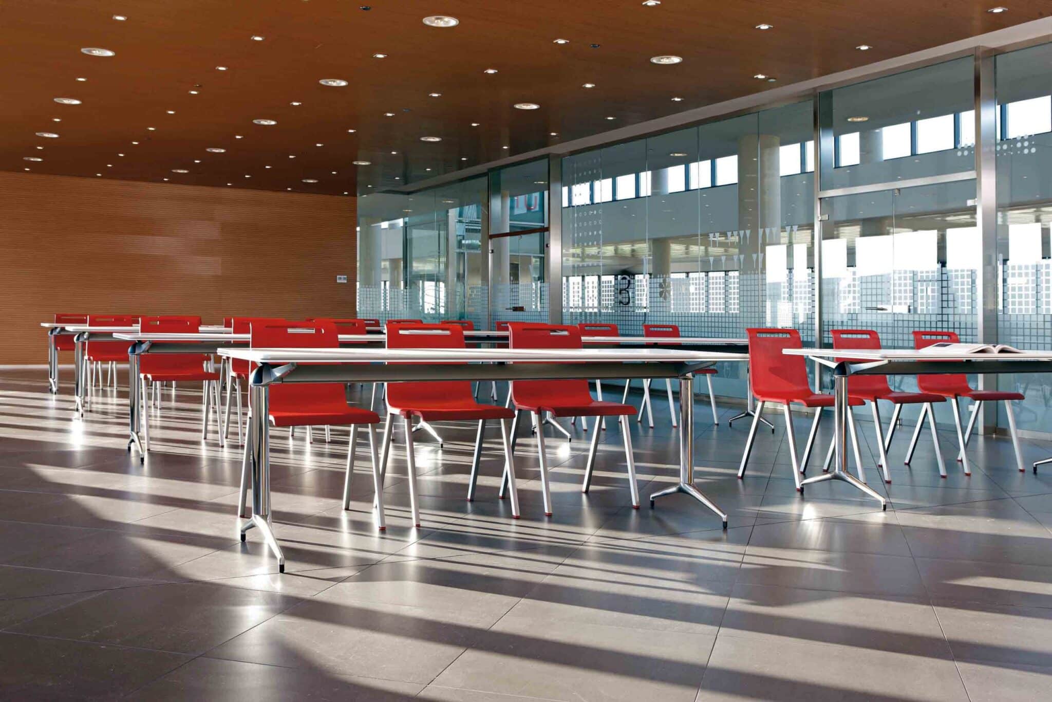 Para espacios colectivos y dinámicos, las mesas de estudio Trama presentan una columna cilíndrica, fabricada en acero, puede encontrarse con acabados en aluminizado, blanco y cromado que garantizan la integración en cualquier entorno. Para los usos intensivos, se facilita el borde amortiguante en la superficie, perfecto para el trasiego diario y movimiento continuado de las mesas.
