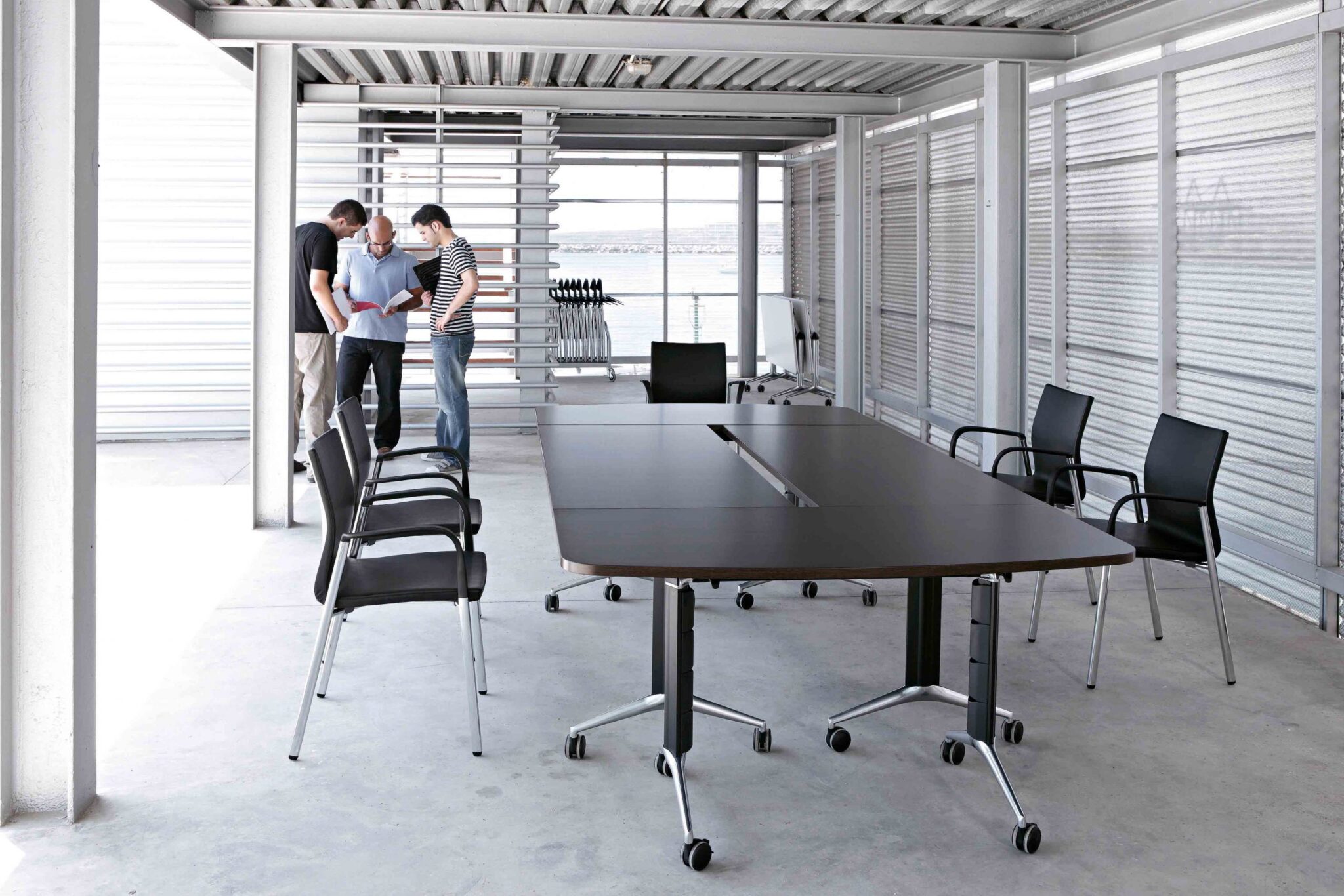 La versión plegable de las mesas de estudio Trama pueden adquirirse con ruedas, haciéndola más dinámica y funcional, además dispone de manera opcional de un faldón también abatible permitiendo que no se pierda la capacidad de ser montada desmontada y almacenada, el cuál es su principal característica.