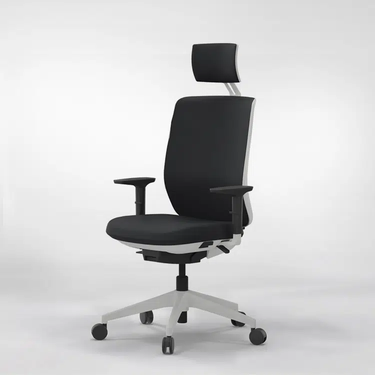 Una silla ergonómica de oficina elevable en altura y acolchada. Su diseño amable es capaz de encajar en cualquier ambiente. Ha sido premiada con un German Design Award, uno de los premios internacionales de diseño más exigentes. Su base es de poliamida blanco con un tapizado en negro.