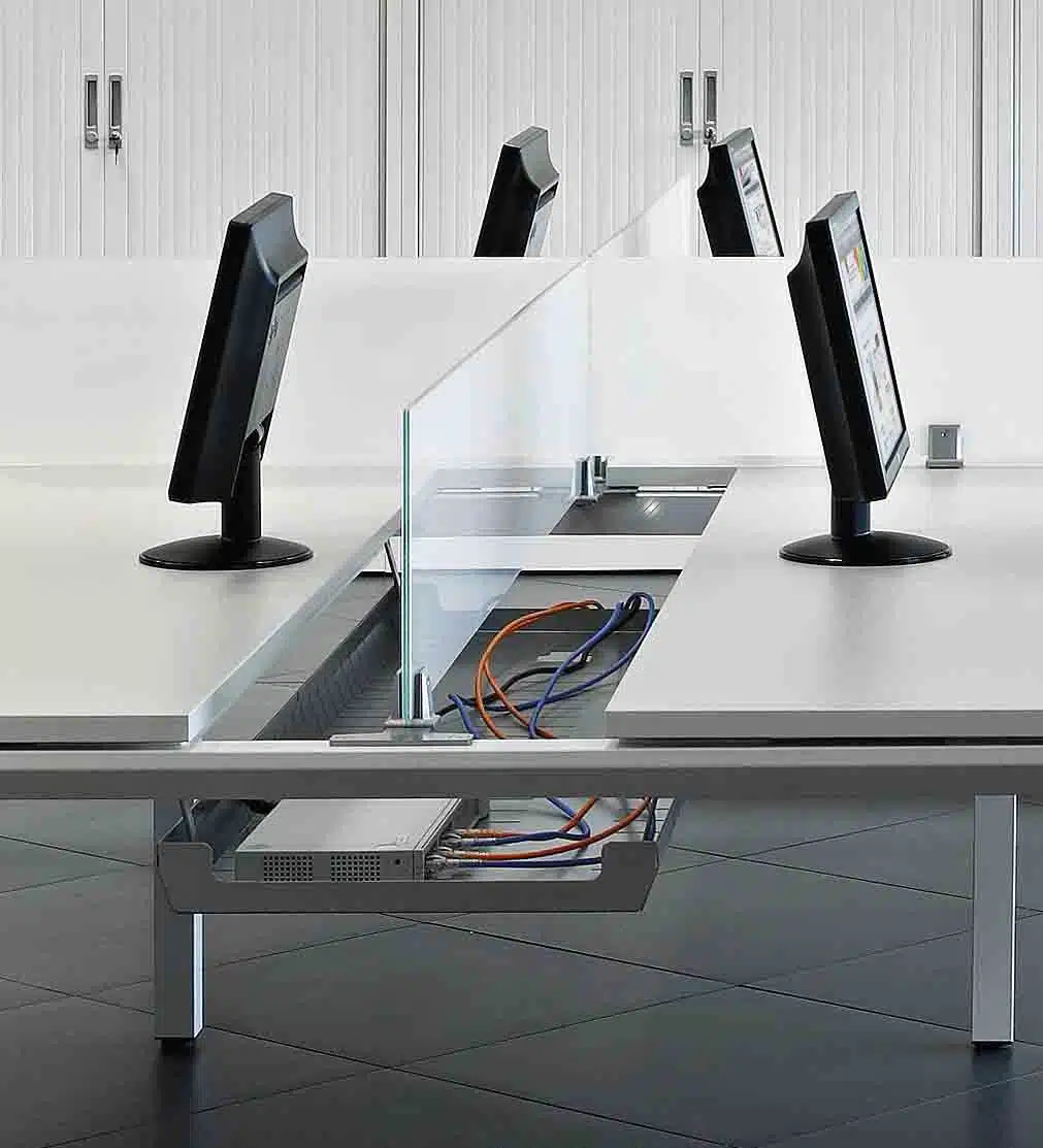 El acceso al cableado, se hace desde una tapa de melamina del mismo color que el tablero, por lo que queda absolutamente integrado con nuestras mesas de oficina Vital Plus. Esta tapa es abatible hacia la superficie, y accederemos de una forma fácil y sencilla al canal de electrificación doble.