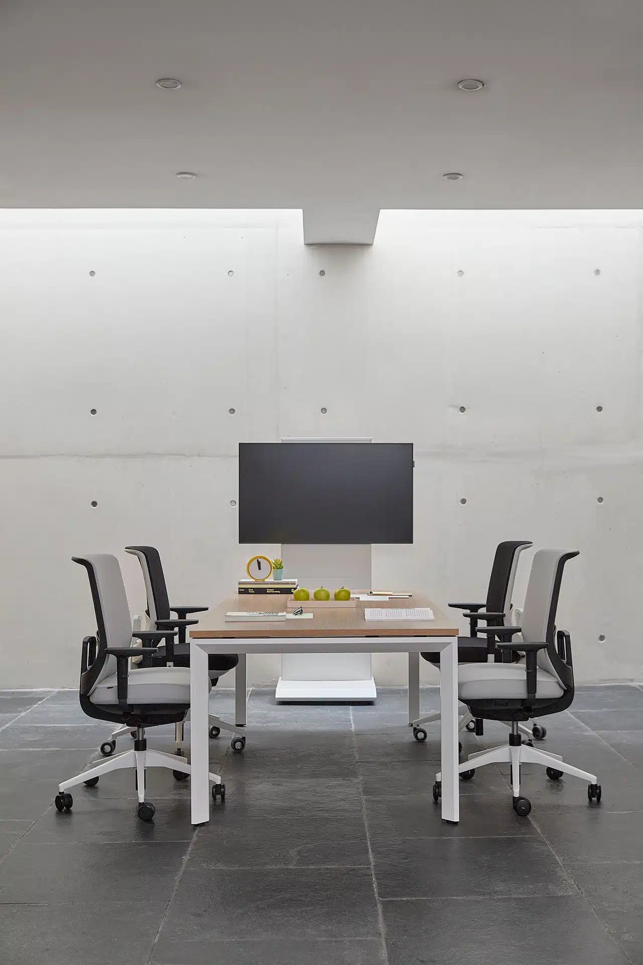 La estructura incorpora un anclaje rápido que permite una perfecta y ágil colocación de la superficie de trabajo en su montaje y facilita el desplazamiento del tablero cuando se requiera acceso a la bandeja de electrificación de gran capacidad para el manejo, organización y almacenaje del cableado. Además, incorpora un sistema de seguridad situado en la parte inferior del tablero que permite manipular el cableado sin riesgo de aplastamiento accidental.