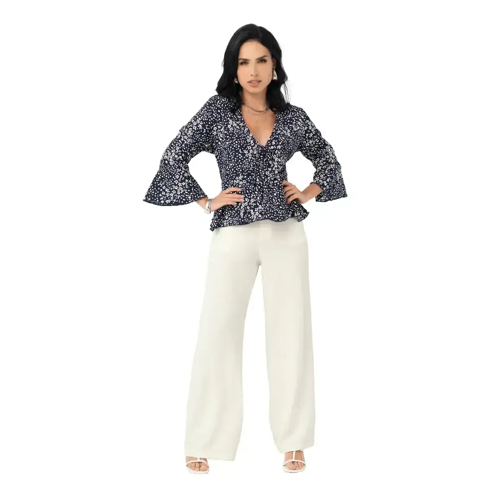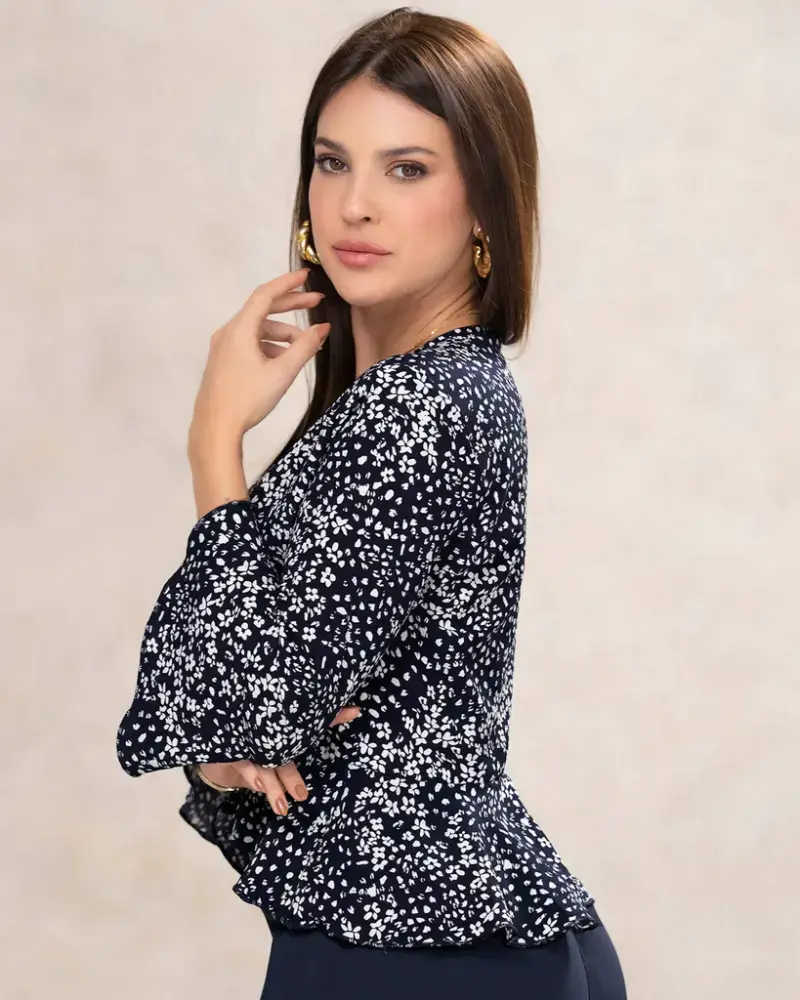 Su delicado estampado y tela ligera crean un efecto visual elegante, mientras que el escote en V con amarre al frente realza la silueta. Las mangas acampanadas y su corte corto añaden un giro moderno que combina a la perfección con jeans, faldas o pantalones de tiro alto. Ideal para lograr un estilo versátil que transita sin esfuerzo del día a la noche.