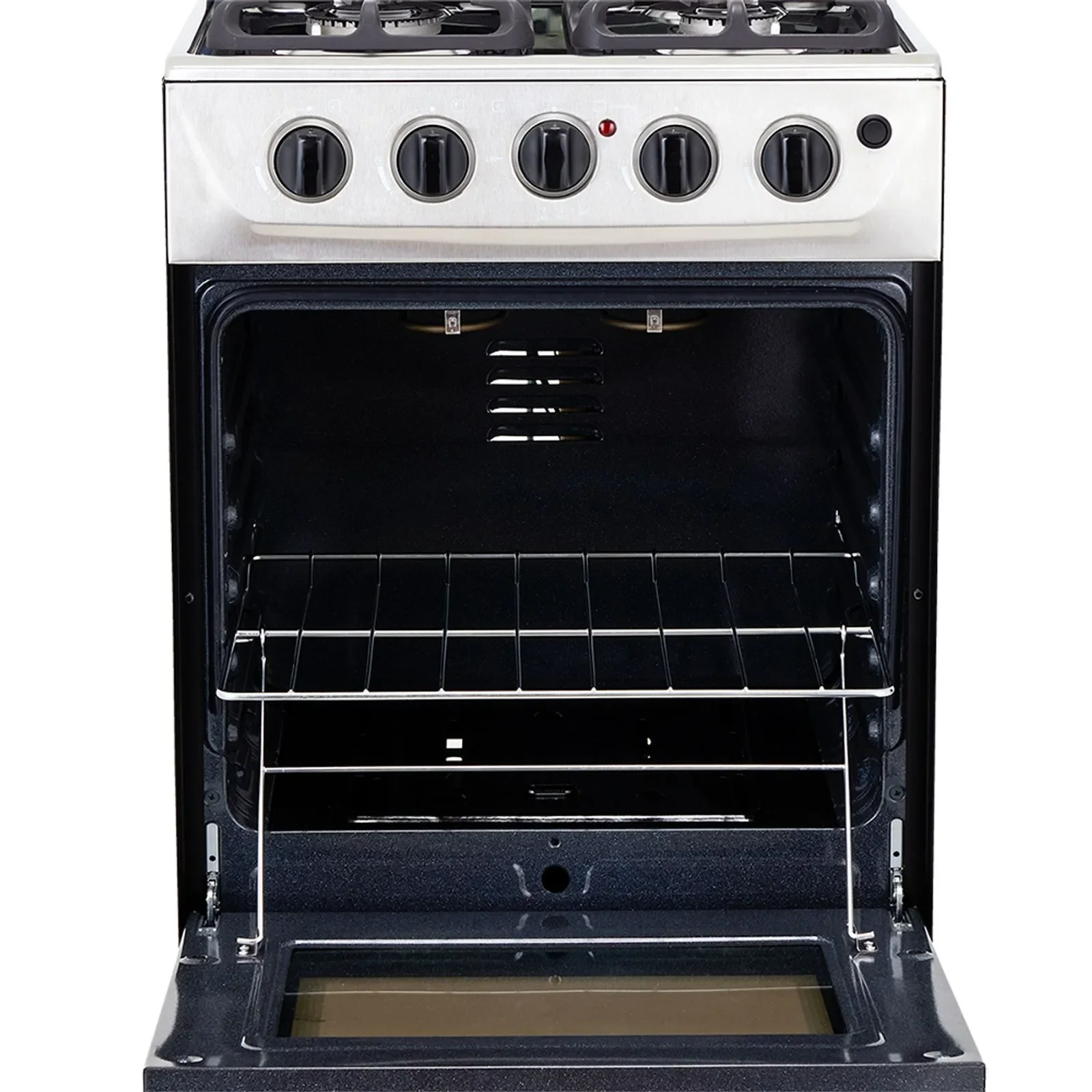 Característica a destacar: 1 quemador rápido y 3 semirápidos, 5 perillas, entrepaño retráctil, gratinador en curvas, parrilla en hierro fundido, fogones diferentes tamaños,puerta del horno en vidrio espejo.