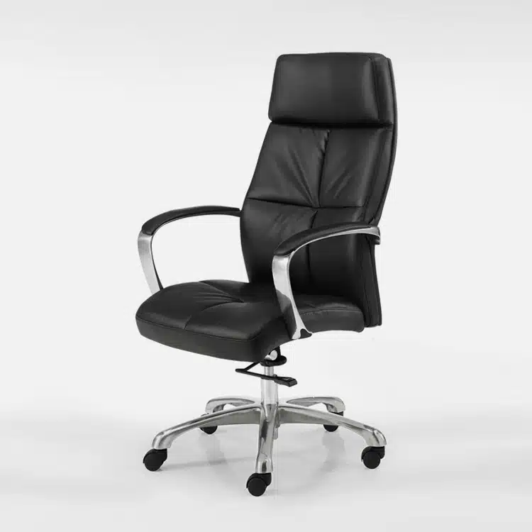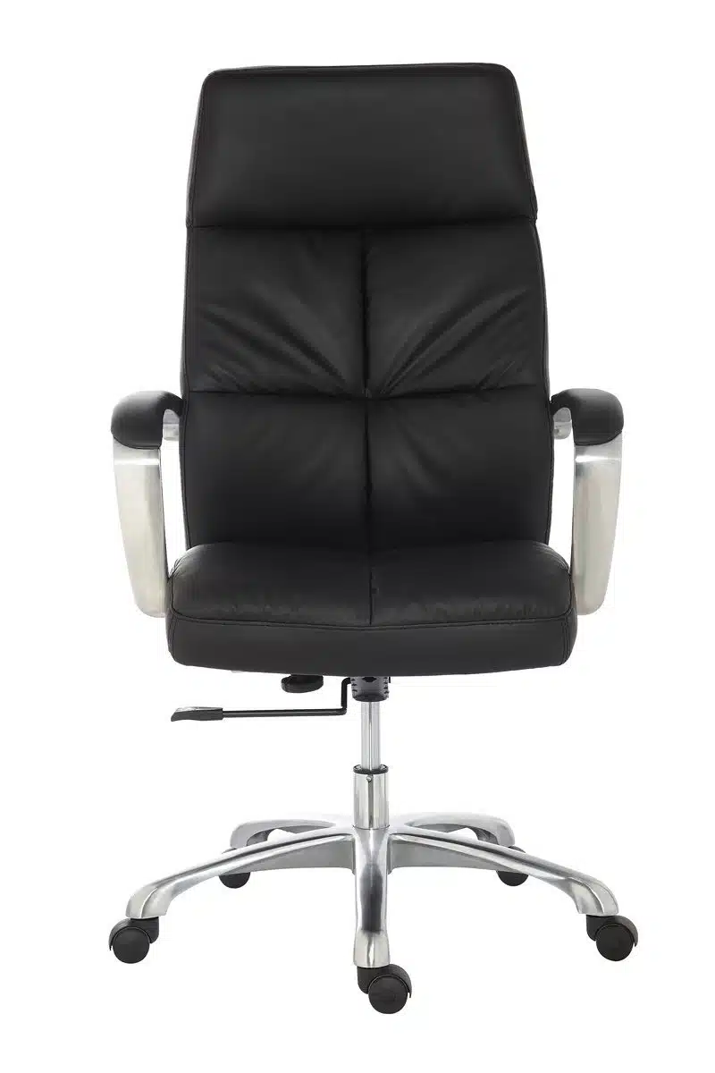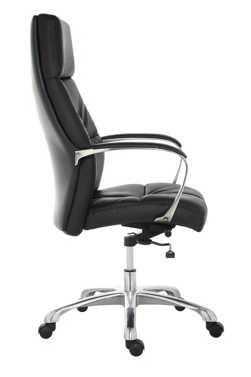 Los reposabrazos de este nuevo sillón clásico de oficina tienen una estructura de acero cromado con inserciones de símil piel en la parte superior, lo cual complementa a la perfección el elegante diseño del asiento y el respaldo y, añade además un plus de comodidad para los brazos. Un despacho de abogados luce mucho más con un sillón de oficina ergonómico como este. La primera impresión es muy importante, y la calidad de este producto lo transforma en una opción increíble para la profesión de abogado. La base de este sillón de oficina está fabricada en aluminio pulido con un diámetro de 68 cm y 5 radios con un aspecto que combina a la perfección con el resto de la silla. Cada radio de la base tiene ruedas de perfil bajo y de color negro fabricadas en Nylon con una rotación excelente.