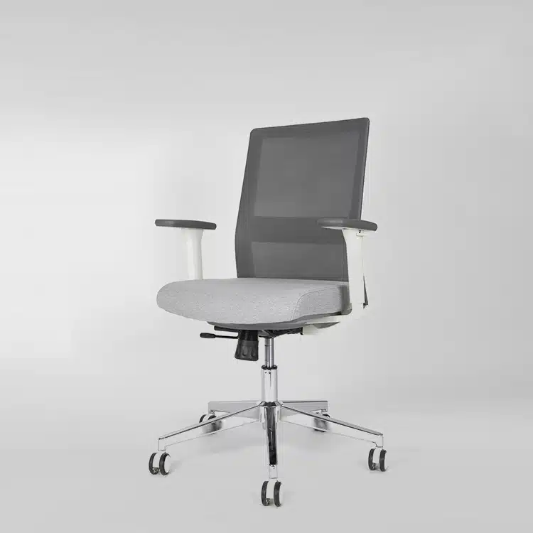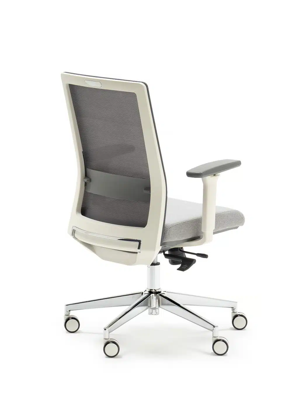 La silla oficina Euromof Niza blanca ofrece mecanismo syncro rediseñado con una sola palanca que facilita su uso, ademas incorpora traslación de asiento para dar más amplitud a las piernas. Novedoso respaldo ergonomico con malla técnica 3D y soporte lumbar regulable.