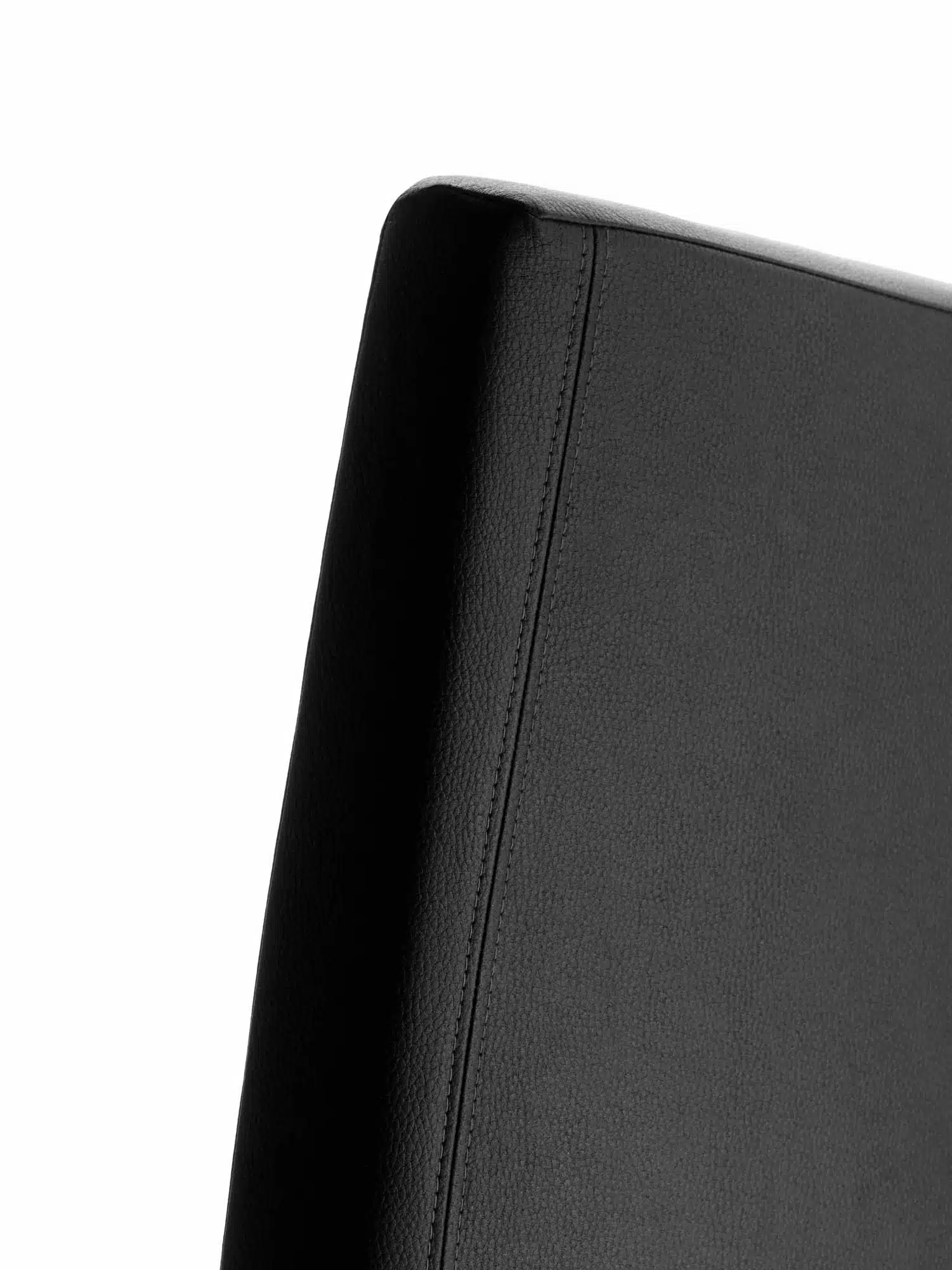 RESPALDO: forma cuadrangular con bordes redondeados. Interior de tubo redondo de acero de Ø 16 x 2 mm reforzado con pletinas también de acero de 6 mm de espesor. Espuma de poliuretano sobreinyectada en molde de resina epoxi con un espesor medio de 60 mm y una densidad de 62 kg/m3. Cabezal opcional para el respaldo alto con estructura interior