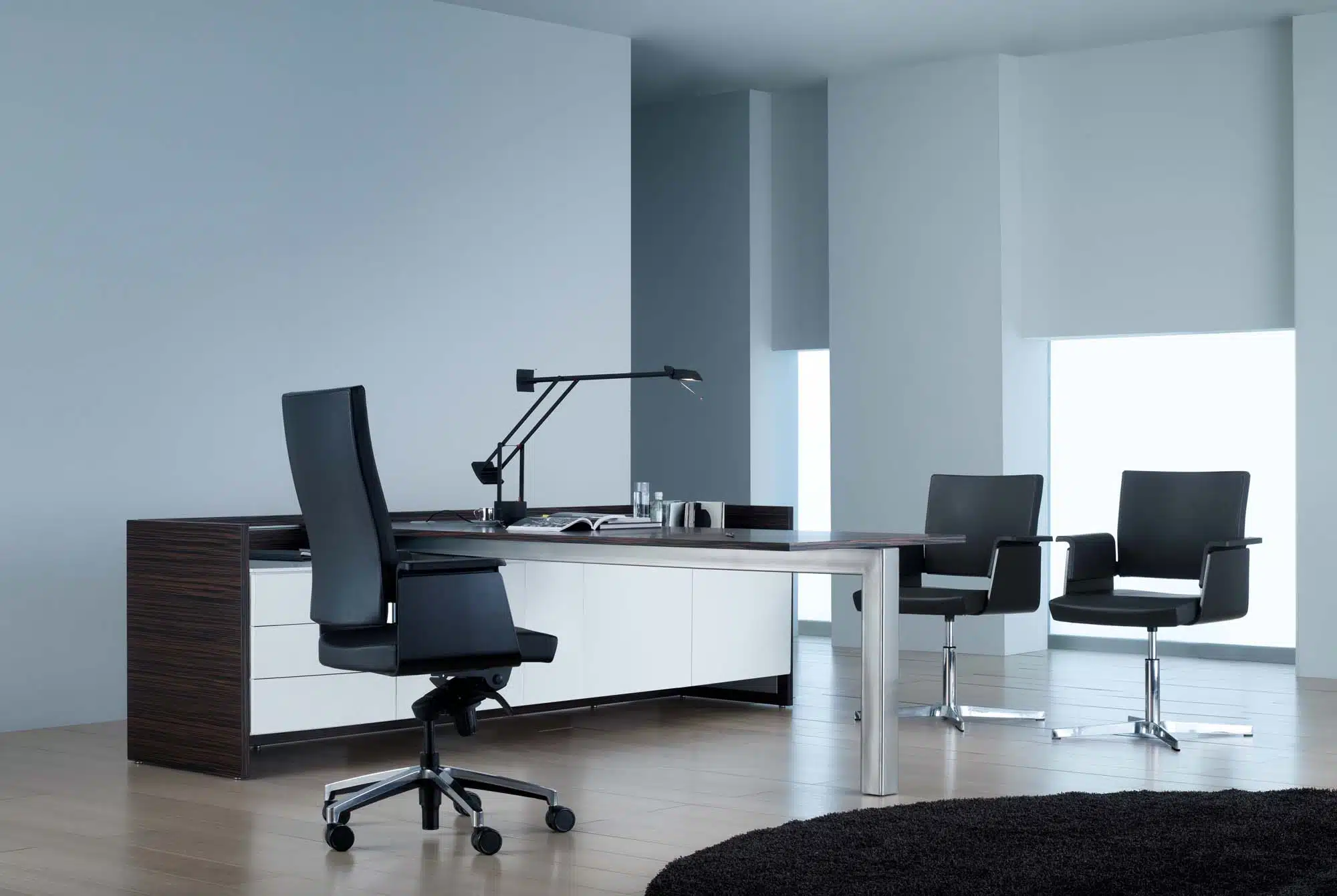 Garbo satisface las necesidades de amueblamiento de espacios directivos: por un lado, dispone de un sillón de dirección de respaldo alto o bajo y carcasa de madera -ébano, nogal o lacado negro-, y por el otro, un confidente giratorio con pistón autocentrante y base plana de aluminio o con base giratoria que comparten los mismos acabados de la carcasa que el sillón.