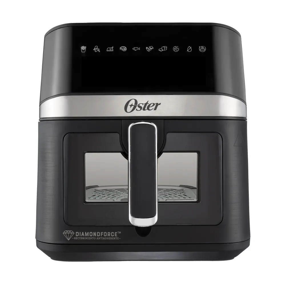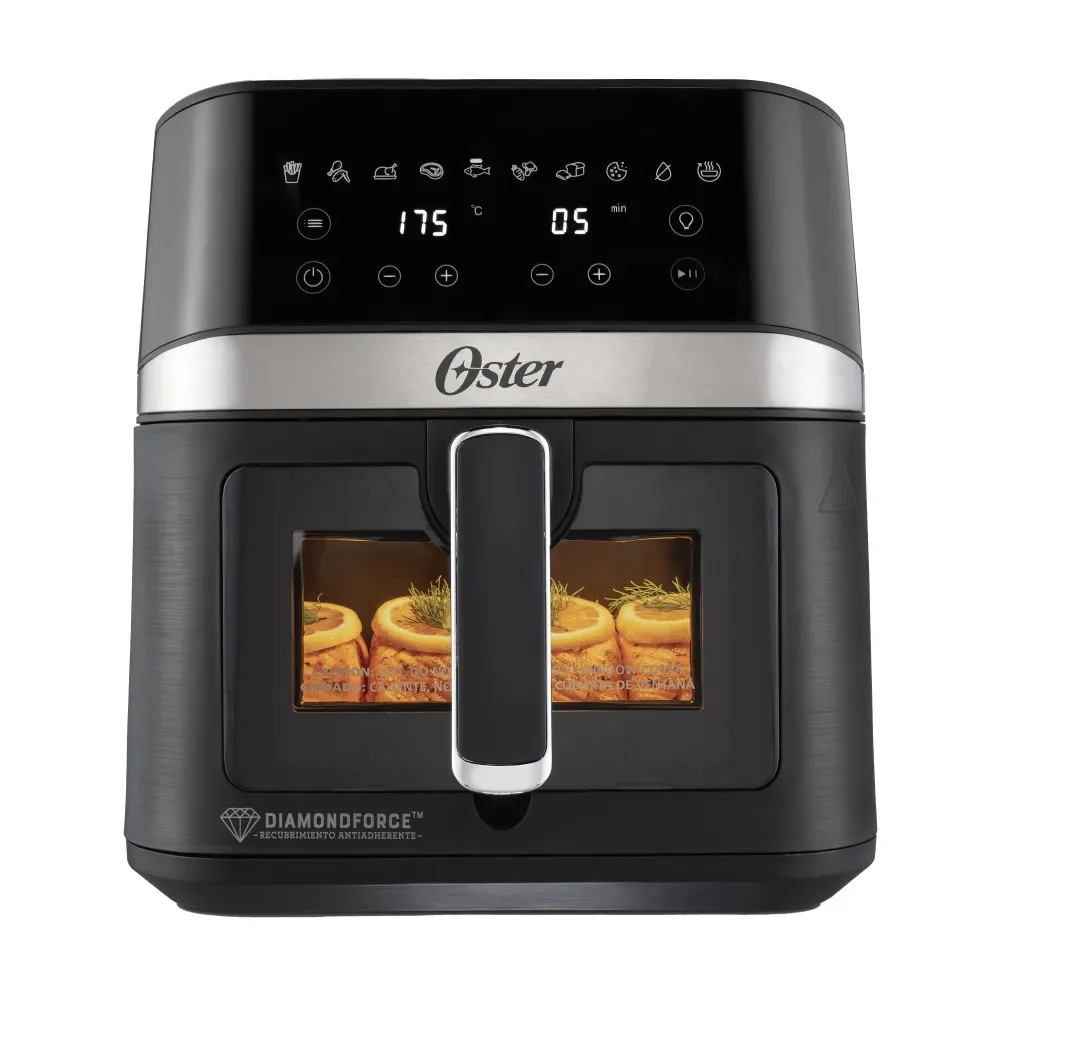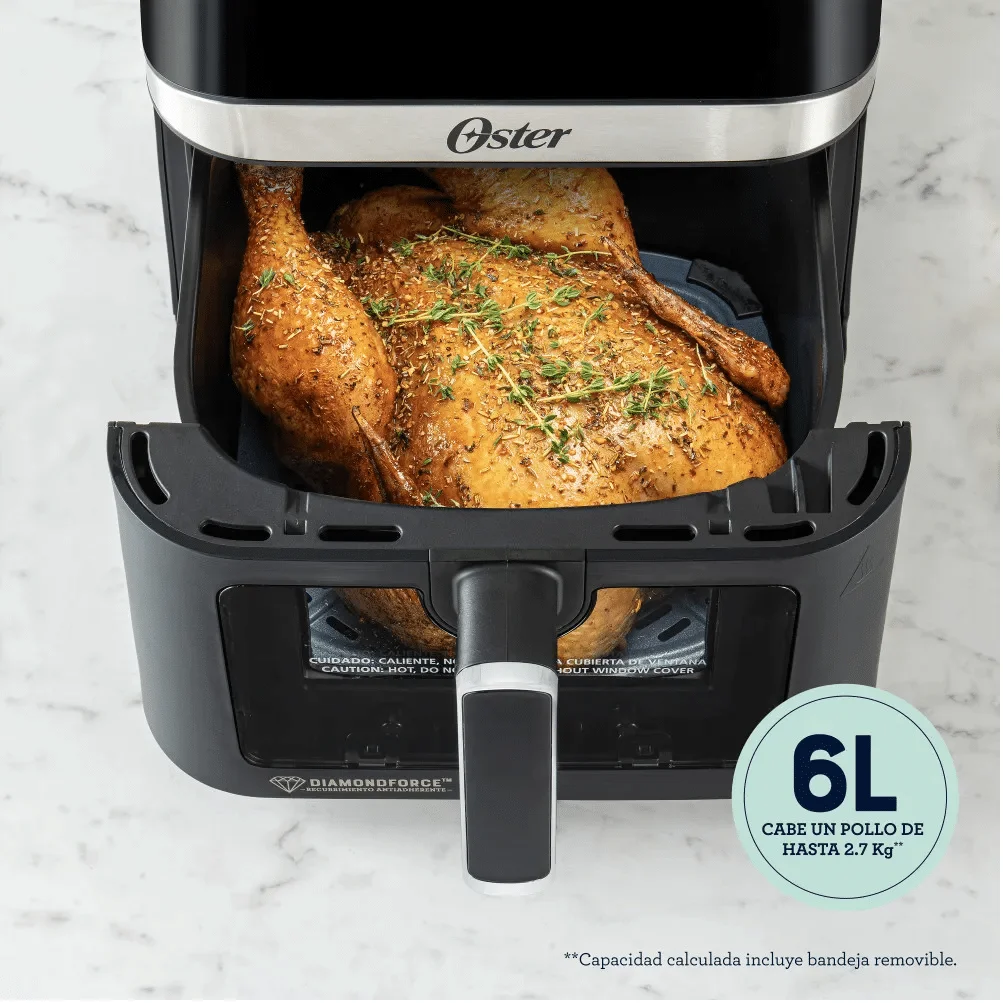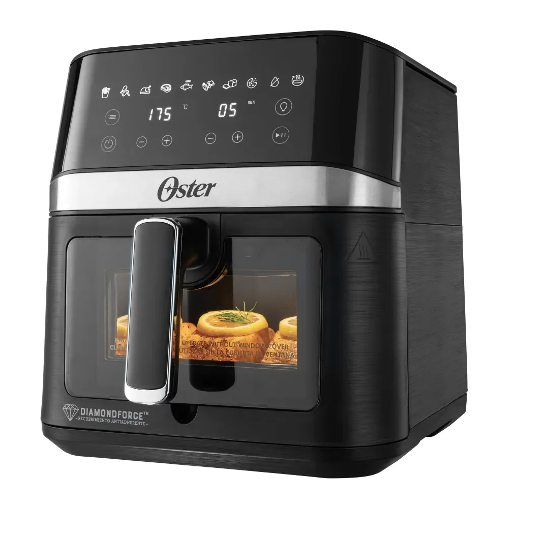 Plegadiza Transforma tu experiencia culinaria con nuestra freidora de aire digital Oster®. Con nuestro recubrimiento Oster® DiamondForce, que es hasta 12 veces más resistente a rayaduras y hasta 15 veces más fácil de limpiar* que los recubrimientos convencionales, tu freidora se mantendrá en perfectas condiciones durante más tiempo. Su capacidad de 6L** permite cocinar un pollo de hasta 2.7Kg. Equipada con una ventana transparente y una luz interna, esta freidora te brinda una visión clara del proceso de cocción en cada paso del proceso. Con 10 Programas automáticos: Papas fritas, alitas, aves, carne, vegetales, pescado/mariscos, hornear, postre, deshidratar y calentar, esta freidora simplifica la preparación de una variedad de platos con solo tocar un botón. Además, nuestro innovador sistema de recordatorio automático te alerta para voltear la comida en medio del ciclo de cocción, garantizando resultados perfectamente dorados y crujientes en cada bocado. Ya sea que estés cocinando alitas, asando verduras o deshidratando frutas, esta freidora digital te ofrece versatilidad y conveniencia en cada uso.