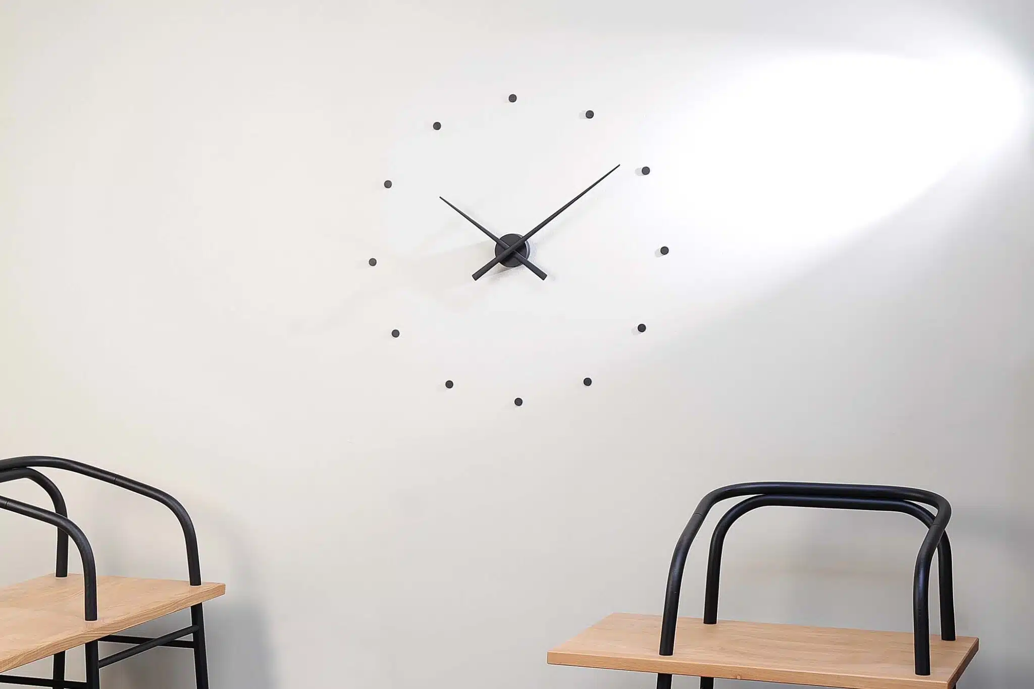 Los relojes de oficina OJ tienen un diseño minimalista, vanguardista y que seguro no deja indiferente a nadie. Sencillo, sin números y únicamente sus 12 círculos perfectos y las dos agujas nos indican la hora.