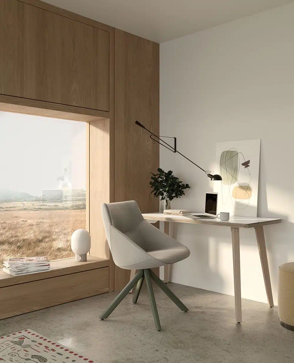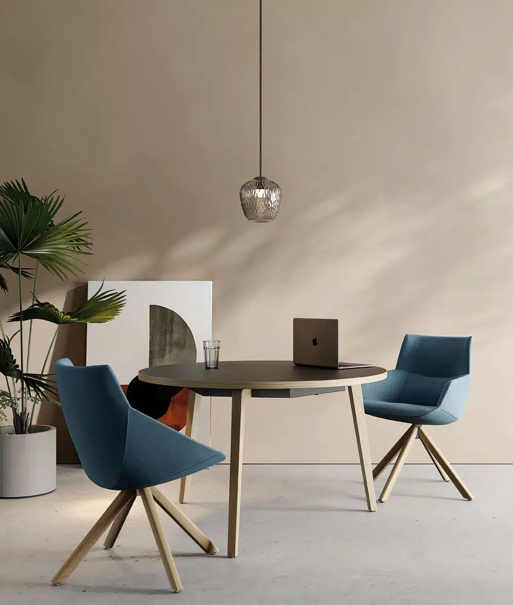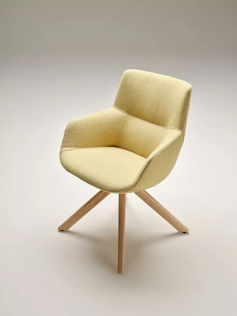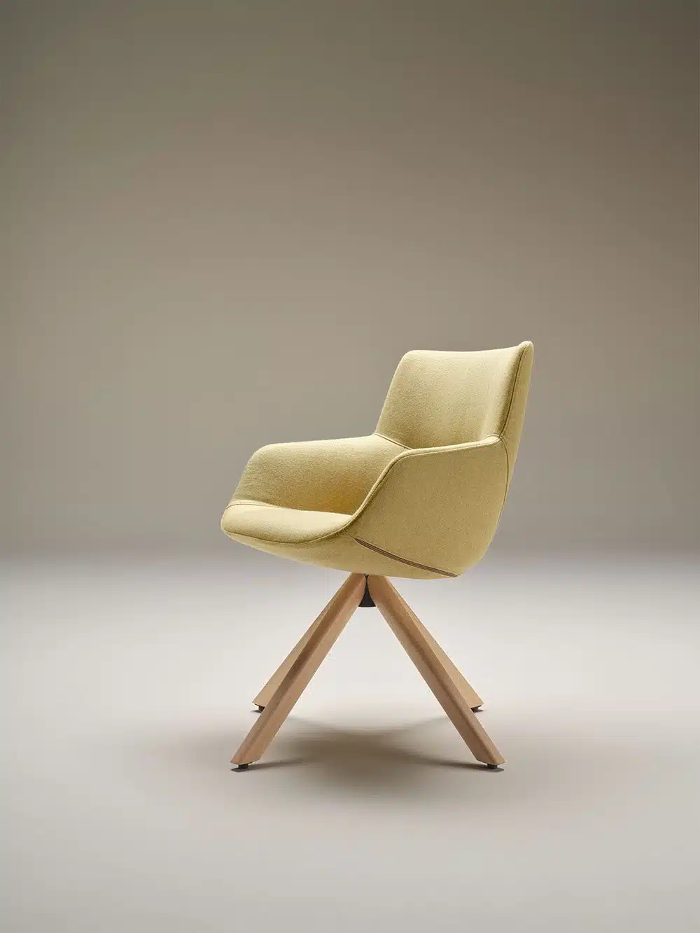 Silla confidente giratoria base piramidal madera Bow Chair Pattio de diferentes apoyos al suelo perfecto para diferentes espacios tanto de oficina -salas de juntas, confidentes, cantinas- como contract -restaurantes, cafeterías, recepciones, salas de conferencia.