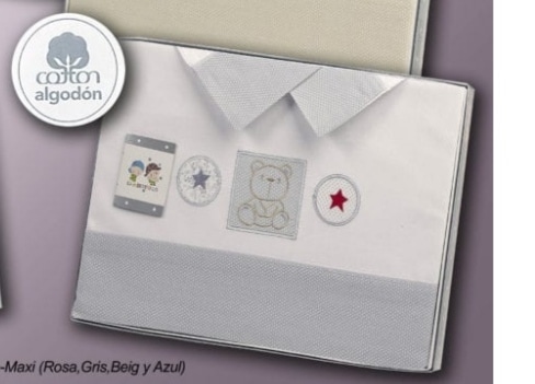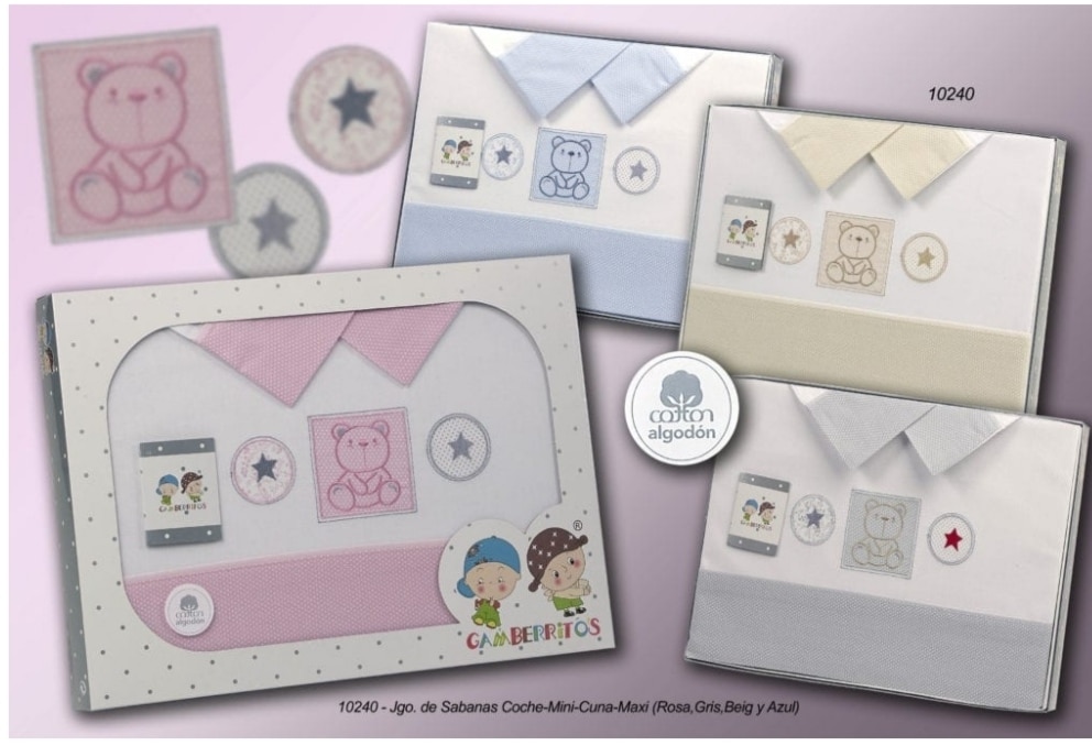Juego de cuna marca Gamberritos presentado en cajita de regalo. Incluye una sábana, bajera y almohadón. Medidas: 60×120 cm.