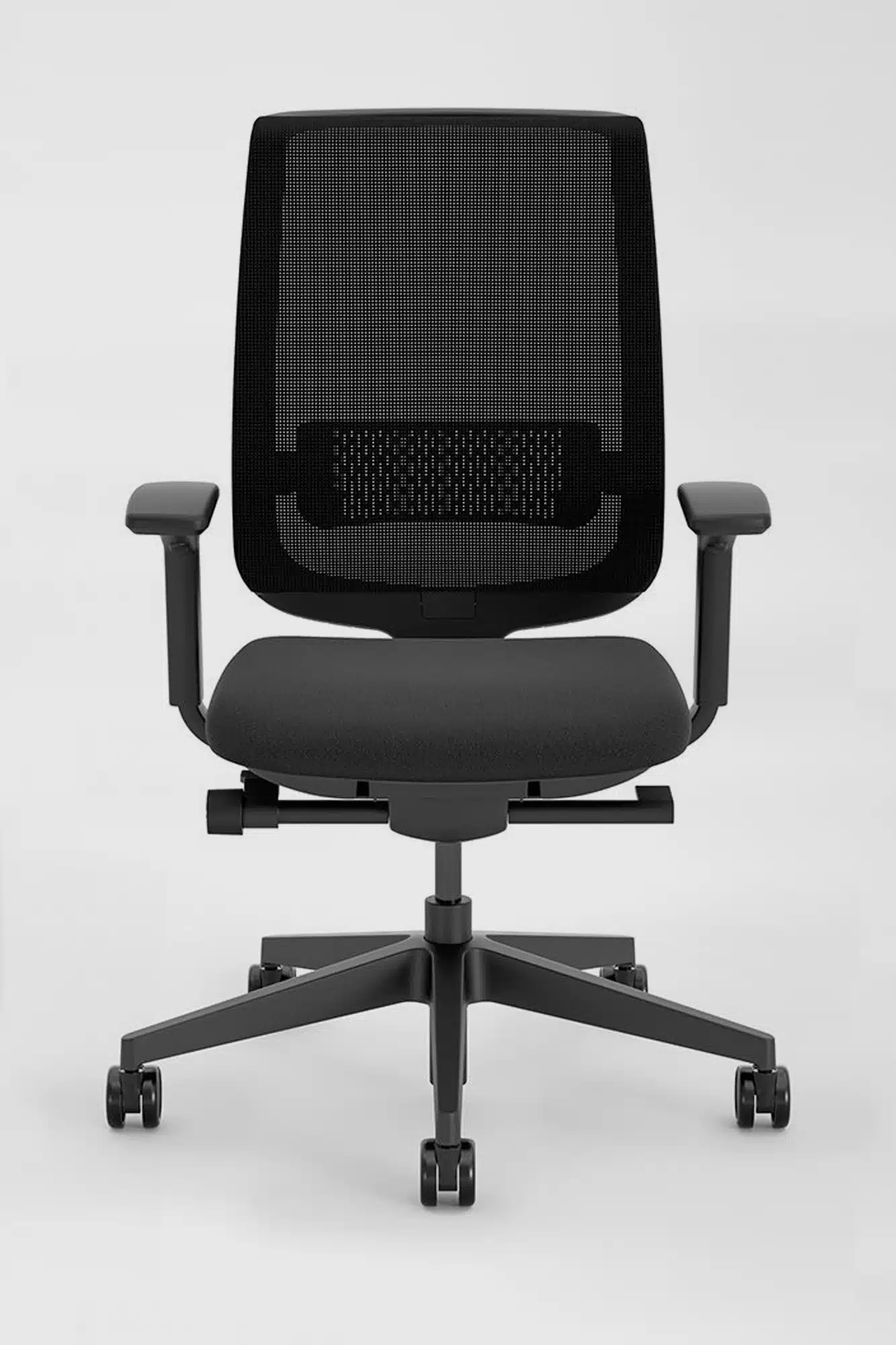 Uno de los valores más diferenciales de esta silla es el tipo de respaldo malla con acabado en negro, con un alto nivel de rendimiento y una estética moderna y actual. Esta malla tiene un tacto aterciopelado que concede al usuario una experiencia agradable y de comodidad. Se ajusta de forma involuntaria a la columna vertebral y gracias a la tensión de la malla se aplica claramente una sujeción firme y, además, se adapta a la fuerza dada por el cliente sobre el respaldo. En el caso del asiento, se aplica un tapizado en negro (AT04) con un 100% de Poliester. Siguiendo el certificado de sostenibilidad MBDC, este material contiene menos de 100 mg/kg de metales pesados.