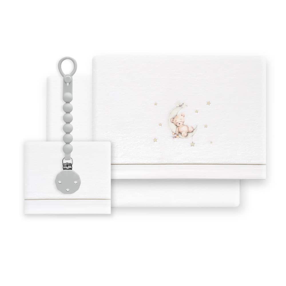 . Triptico juego sabanas Cuna Calentitas Invierno CORALINA Estampado OSO LUNA ESTRELLAS Bl/Verde + Broche INTERBABY 30208-13